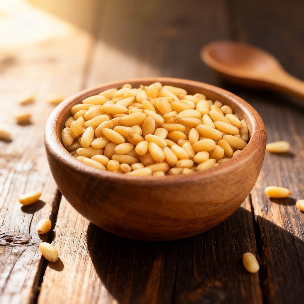 Pine nuts are soft, buttery seeds rich in magnesium, zinc, and good fats, supporting metabolism, brain function, and energy production.