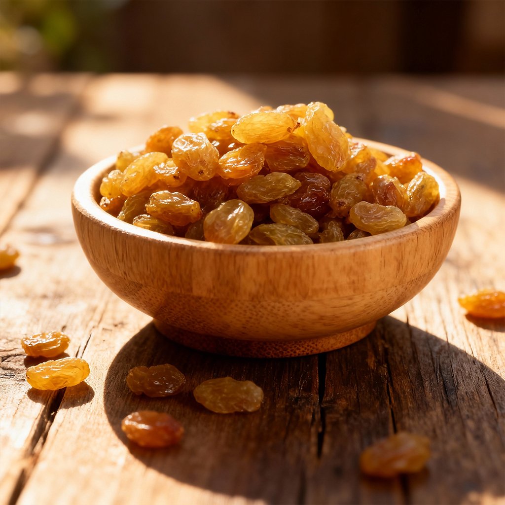 Raisins are naturally sweet dried grapes high in iron, potassium, and antioxidants, providing instant energy and aiding heart and digestive health.